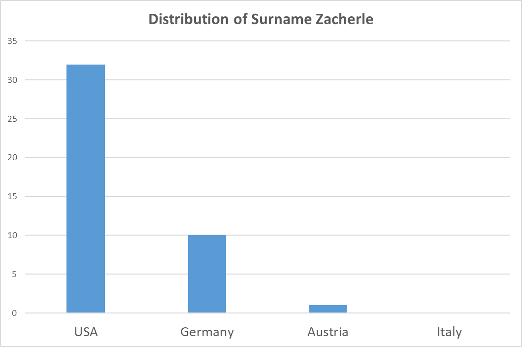 This is a picture of the world wide dissemination of the Zacherle family in the year 2000. The one person with the (former) last name Zacherle living in England has changed the name and is therefore obviously missing.